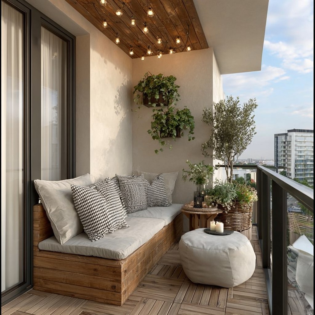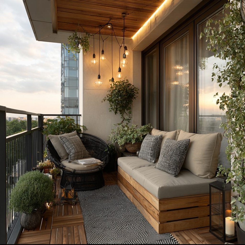- Текстиль: 1–2 влагостойкие подушки, небольшой уличный коврик нейтрального тона, плед для прохладных вечеров (хранить внутри).