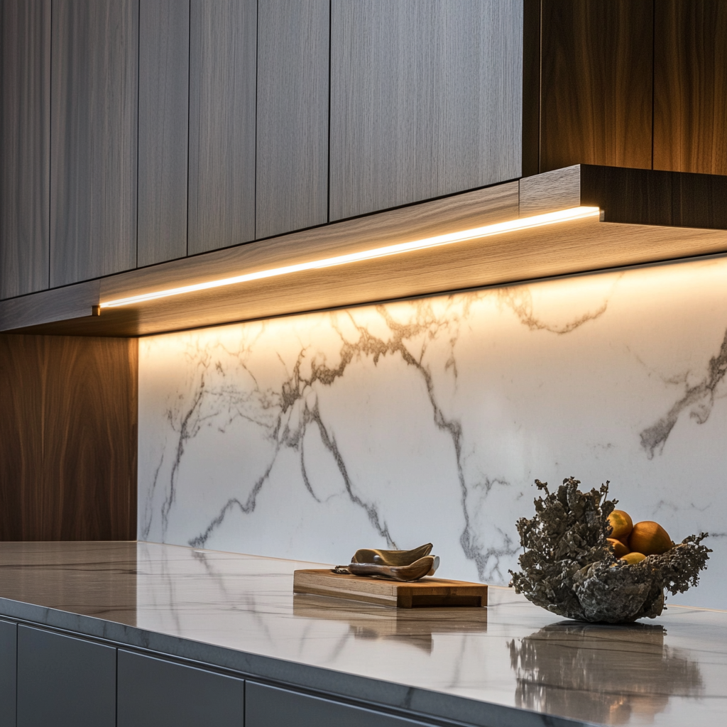 Фартук редко должен быть главным. В большинстве удачных кухонь он либо поддерживает столешницу, либо мягко дополняет фасады.